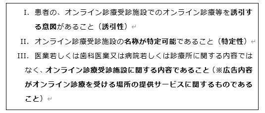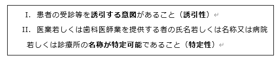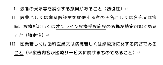 要件Ⅰ及びⅡは、従前から医療広告の要件として認められた誘引性及び特定性の要件を、そのままオンライン診療受診施設に関する広告の要件に流用したものです。