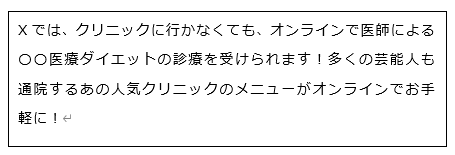 - 医師の氏名や診療所の名称は特定できないものの、オンライン診療受診施設の名称(「X」)が特定可能なので、特定性あり(要件Ⅱ充足)、