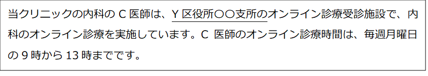また、新15号が定める、㋑勤務する医師又は歯科医師がオンライン診療受診施設を利用してオンライン診療を行う病院又は診療所における「当該オンライン診療の内容」とは、勤務する医師又は歯科医師がオンライン診療受診施設を利用してオンライン診療を行う場合のそのオンライン診療の内容や提供条件のことをいいます。具体的な表示例は、次のとおりです。