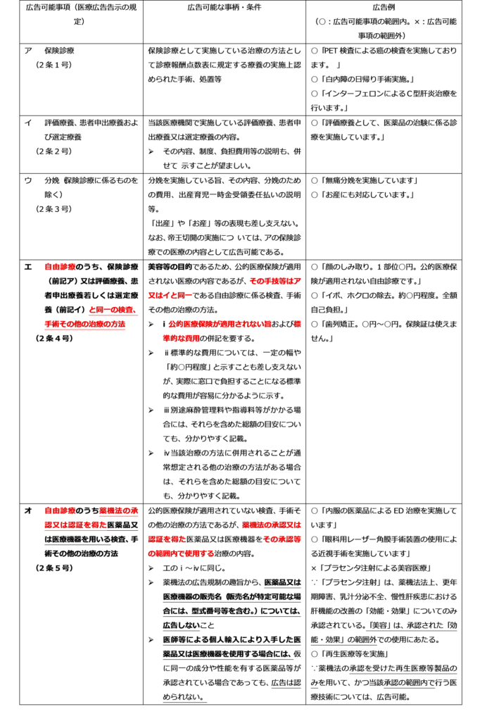 厚生労働大臣が定めた医療広告告示2条は、従前から、①検査、手術その他の治療方法については、5つの事項を広告可能事項として限定列挙しており、改正によってもこの内容は変わりません。5つの広告可能事項について、それぞれの広告可能な事柄や条件等をまとめると、次の表のとおりです。