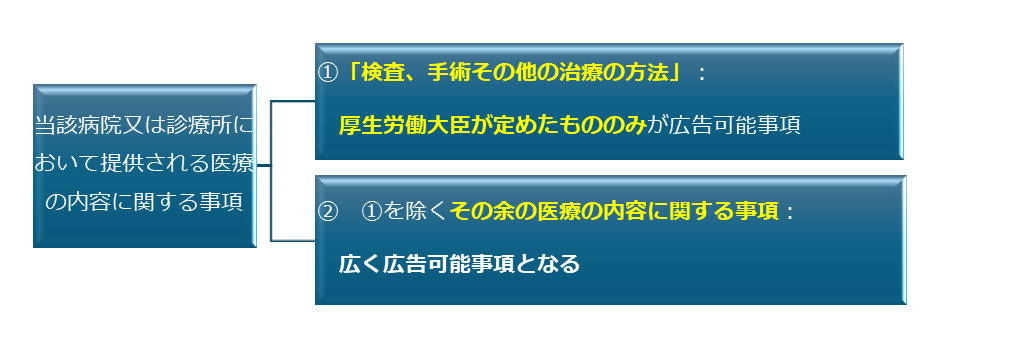 病院又は診療所において提供される医療の内容に関する広告可能事項については、従前から、次のとおり2つの事項に分けられ、それぞれ、規制の態様が異なっています。この点は、改正によっても変わりません。