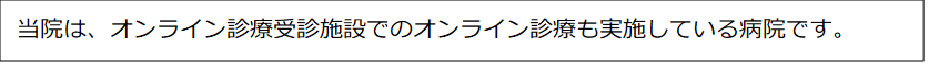 新15号が定める、㋐勤務する医師又は歯科医師がオンライン診療受診施設を利用してオンライン診療を行う病院又は診療所における「当該オンライン診療を行う旨」とは、勤務する医師又は歯科医師がオンライン診療受診施設を利用してオンライン診療を行っていることをいいます。具体的な表示例は、次のとおりです。