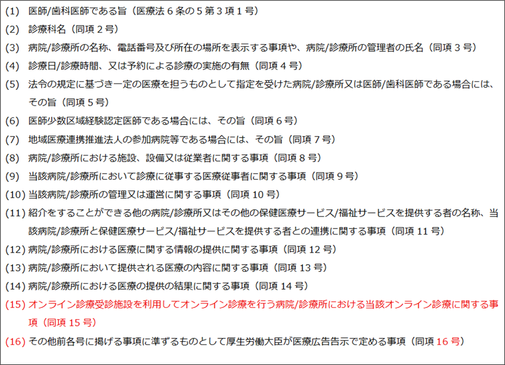 改正により、新たに、15号に、「その勤務する医師又は歯科医師がオンライン診療受診施設を利用してオンライン診療を行う病院又は診療所にあっては、当該オンライン診療を行う旨及び当該オンライン診療の内容に関する事項」が加わり、これに伴い、改正前の15号の包括規定は、条ずれにより16号になりました(次の一覧表の赤字表記部分)。